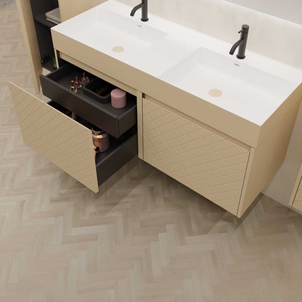 Una altura ideal que respeta el espacio, creando una atmósfera de amplitud y ligereza. En sus versiones de 60 cm y 80 cm, cada módulo esconde un secreto: un cajón interno diseñado para el orden meticuloso de tus productos de cuidado personal.