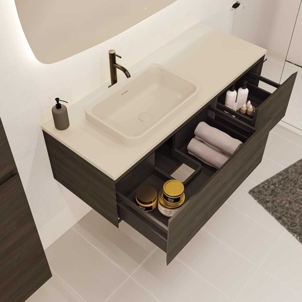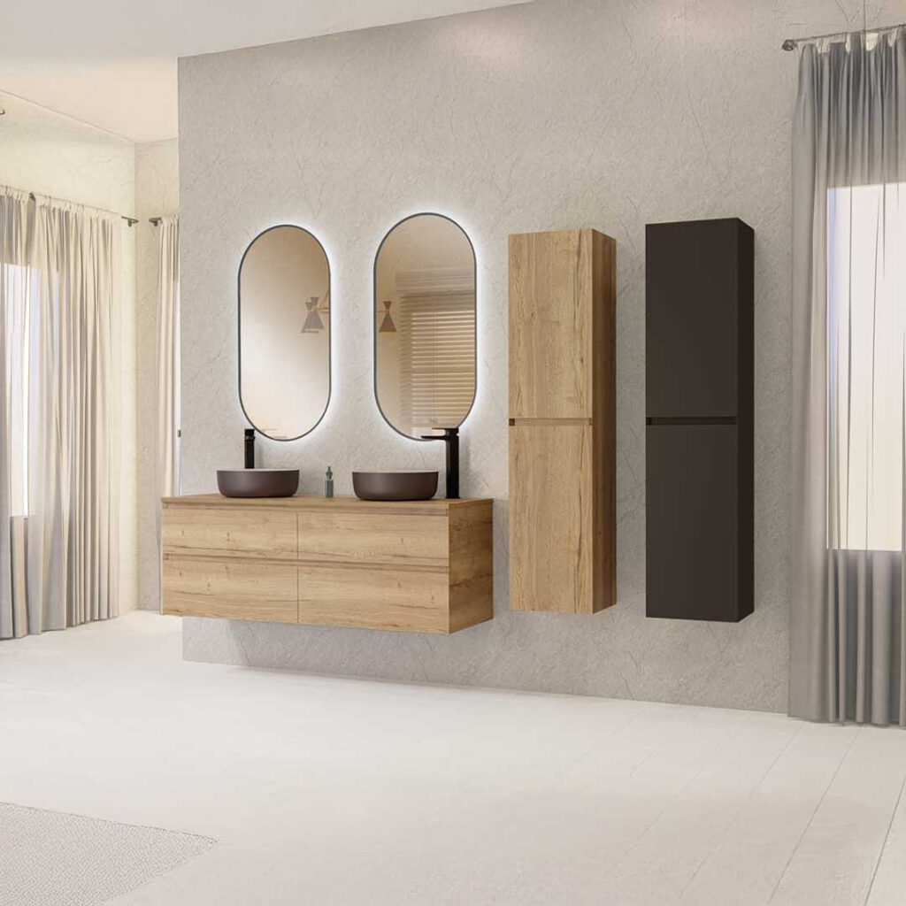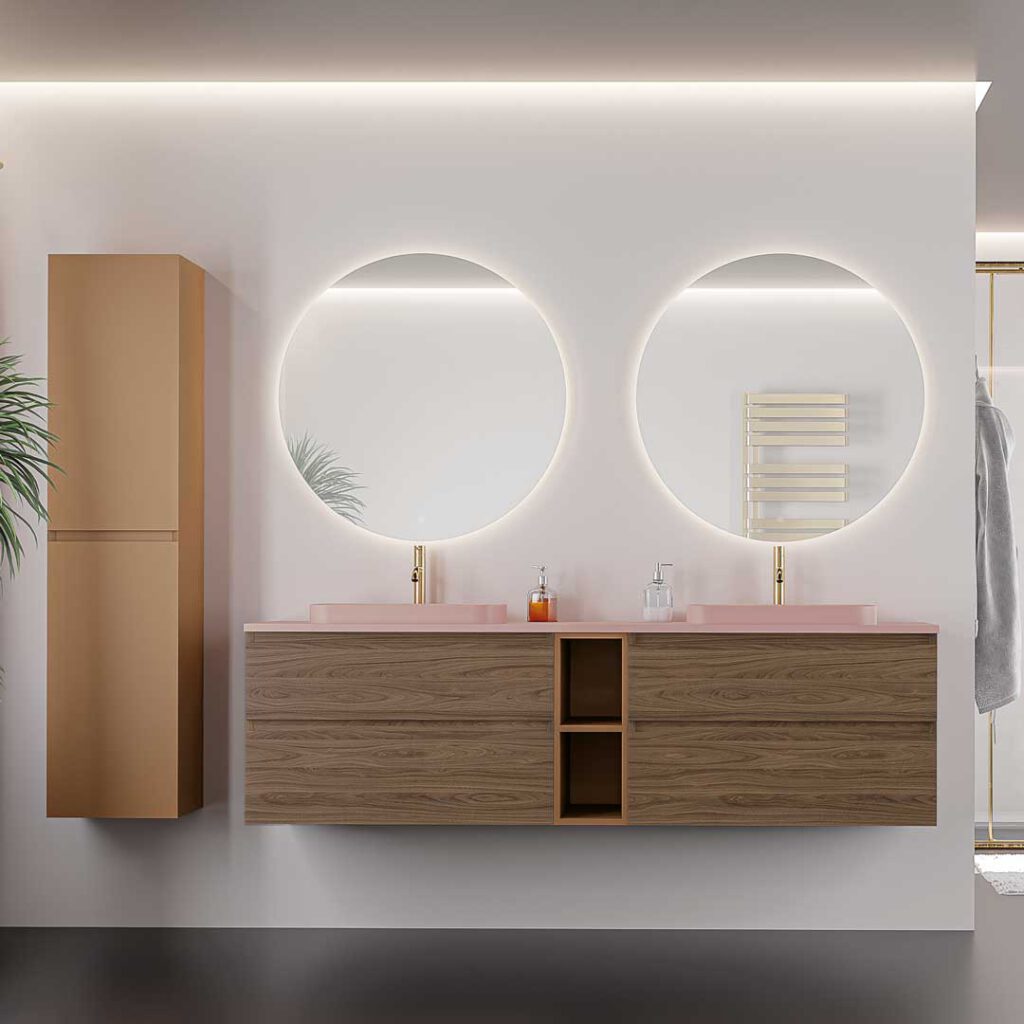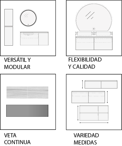 Amplia gama de medidas para lavabos individuales o dobles, con opciones de módulos laterales y columnas para complementar cualquier espacio.