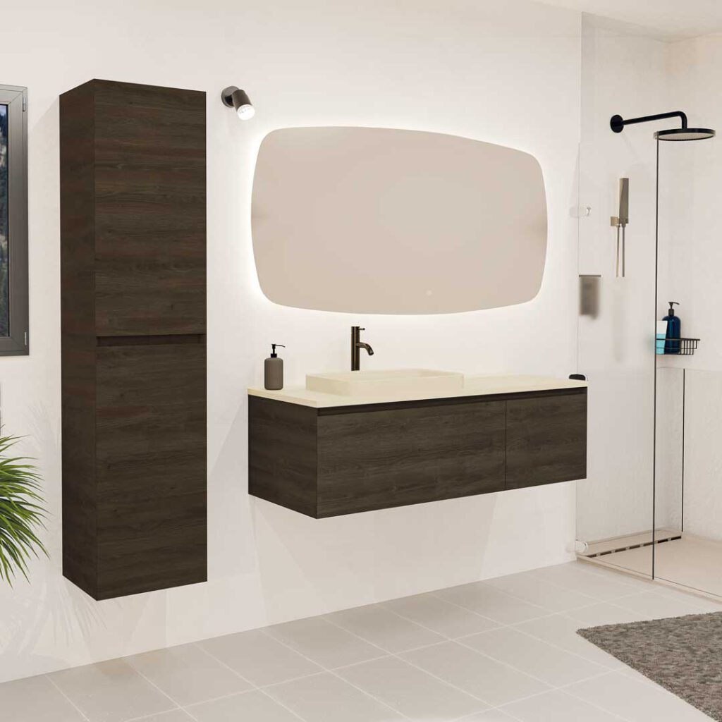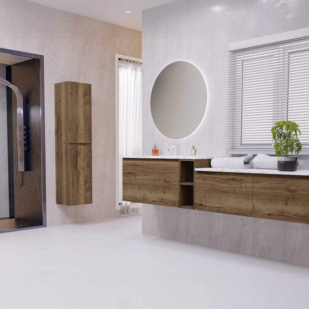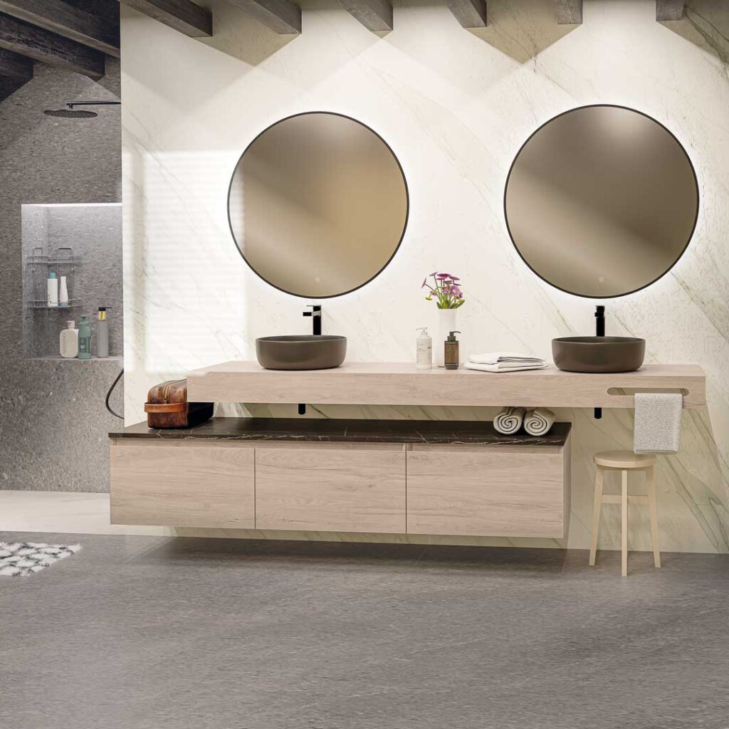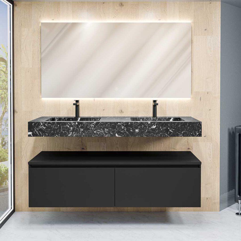 Amplia gama de medidas para lavabos individuales o dobles, con opciones de módulos laterales y columnas para complementar cualquier espacio.