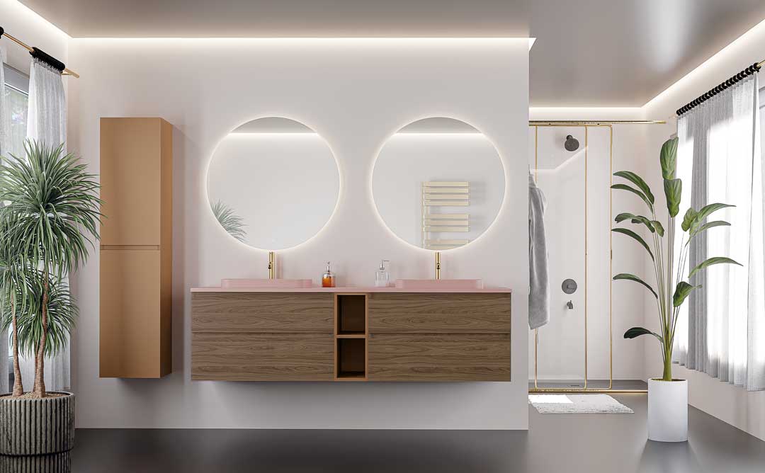 Amplia gama de medidas para lavabos individuales o dobles, con opciones de módulos laterales y columnas para complementar cualquier espacio.