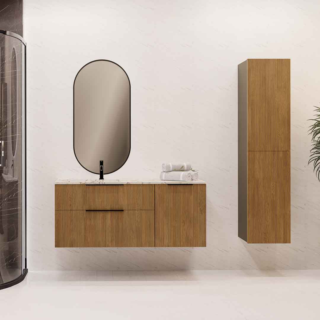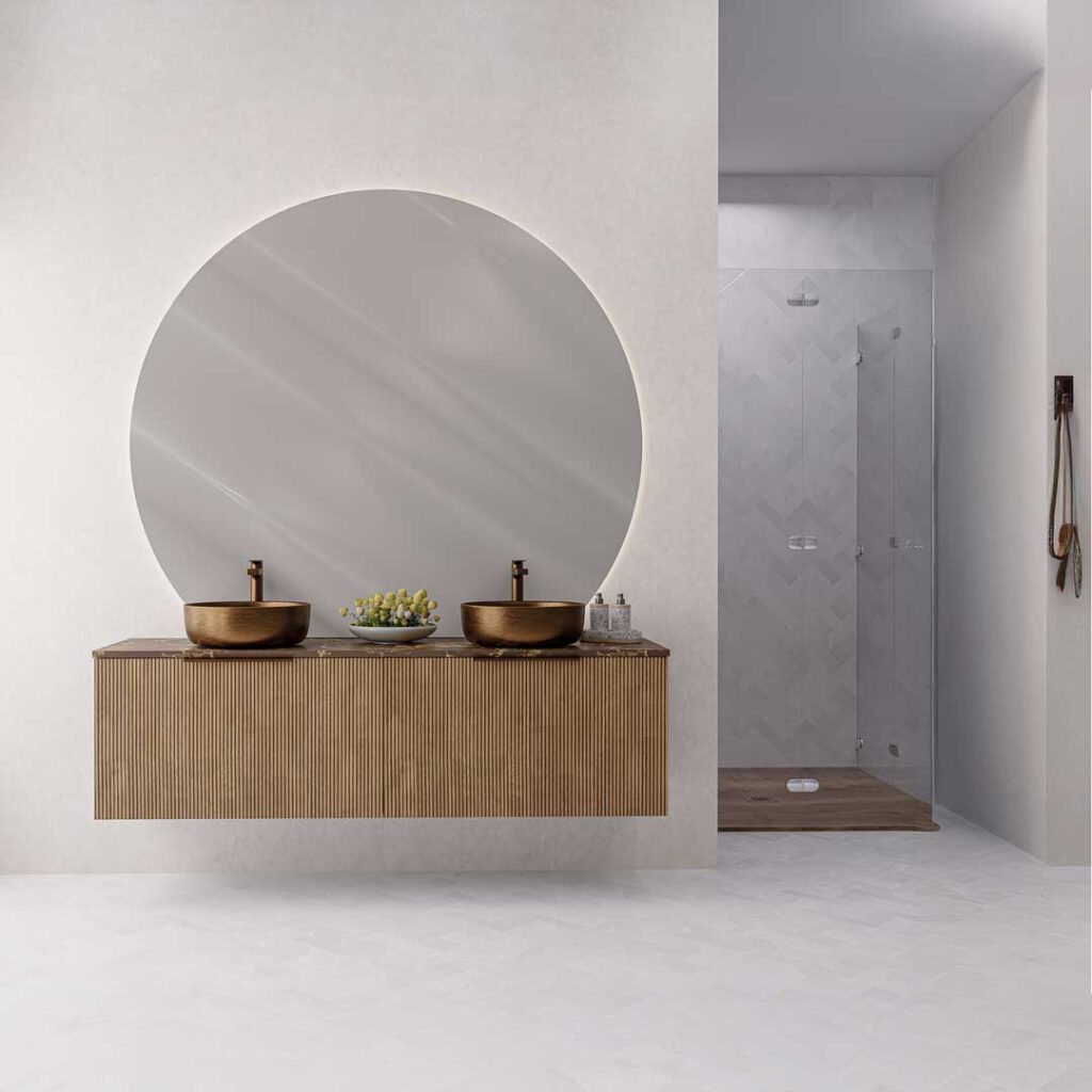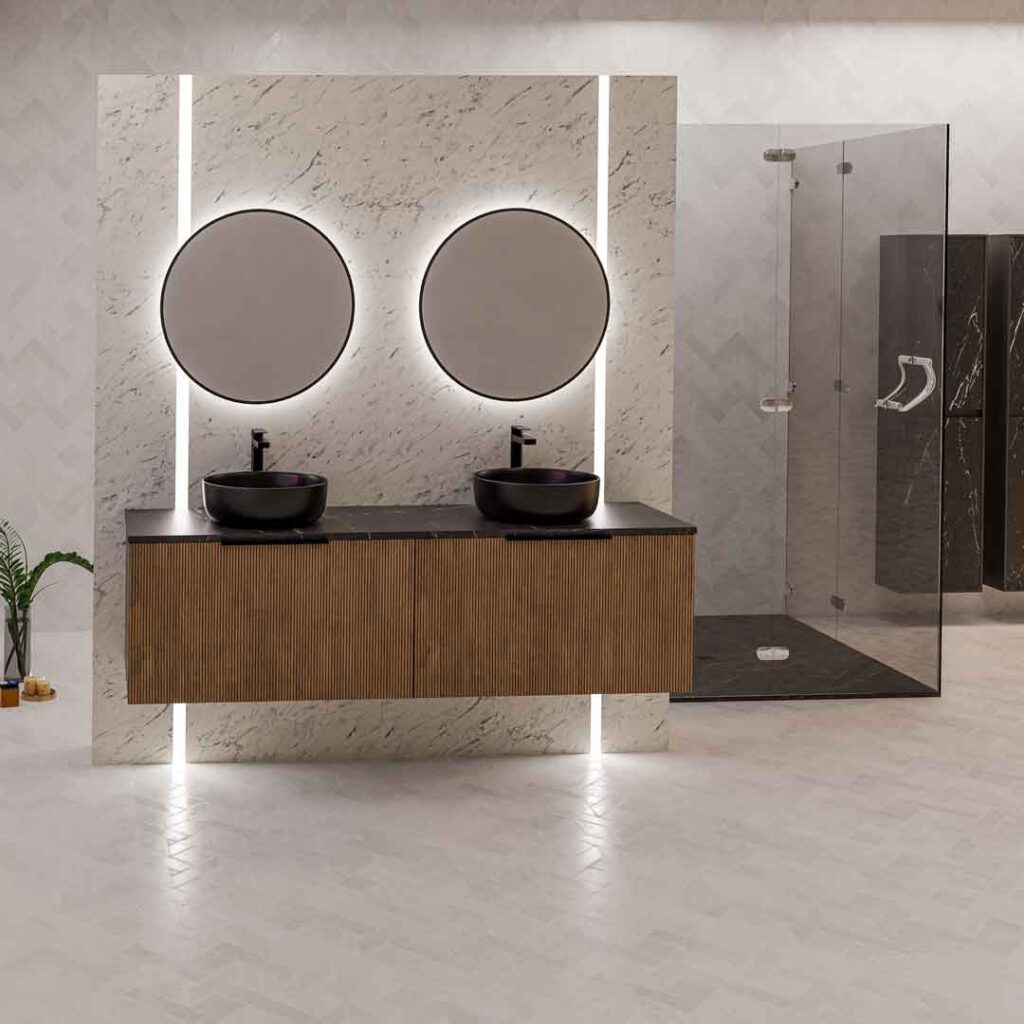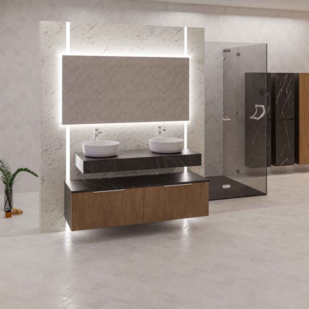 La colección Minerva es la máxima expresión del diseño contemporáneo en el baño. Su frontal, caracterizado por una textura acanalada de efecto 3D, crea un juego de profundidad y movimiento que atrae todas las miradas. Fabricada en melamina de alta resistencia, esta colección ofrece la belleza de la textura con la durabilidad que tu día a día exige.