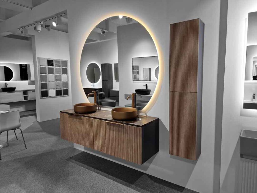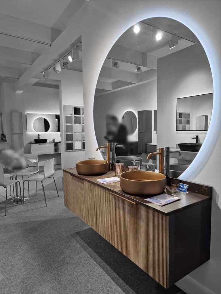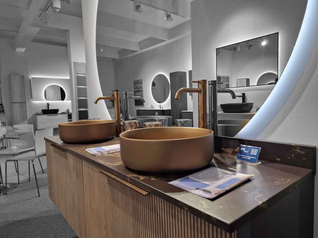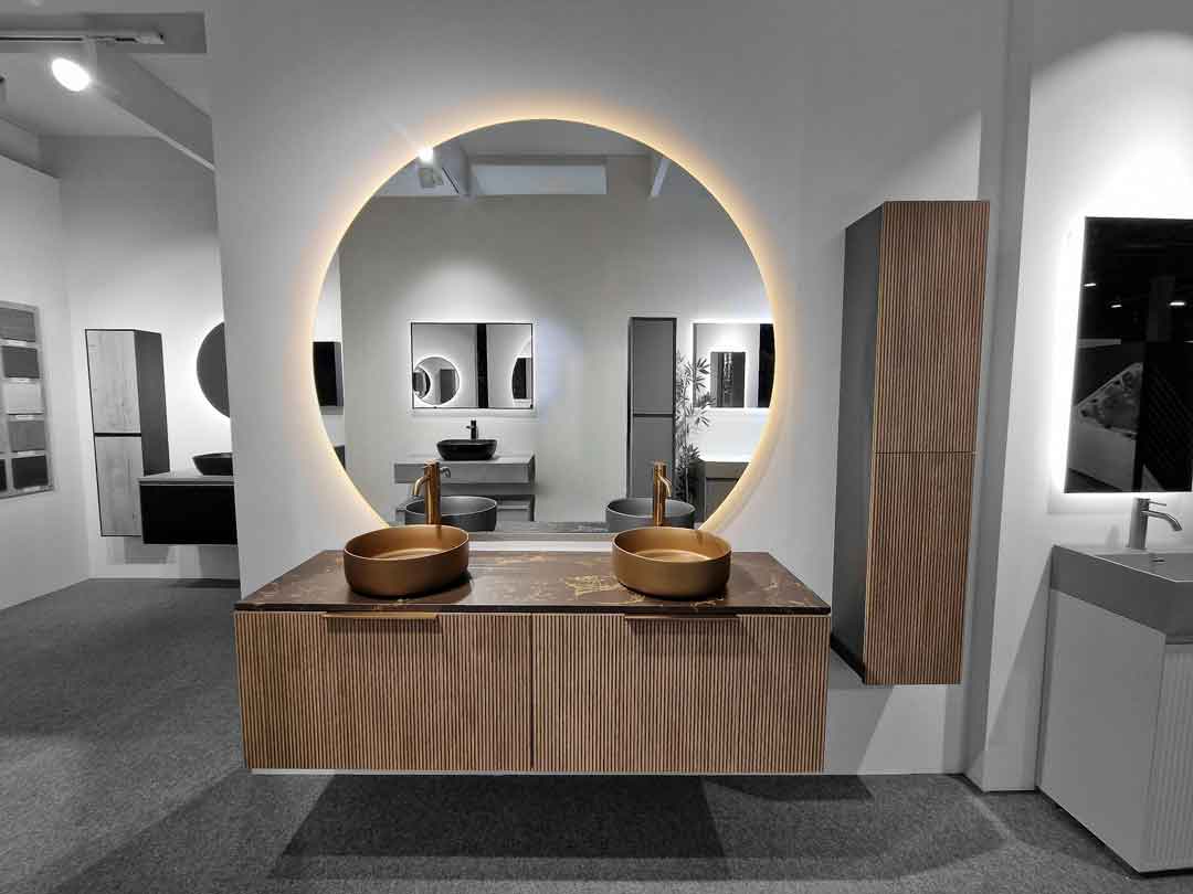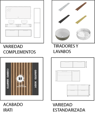 Personaliza tu estilo con opciones en cromo, negro, bronce y oro pra los tiradores y lavabos sobre encimera, lavabos de piedra o solid surface que combinen con el ambiente y su cálido frente Irati.
